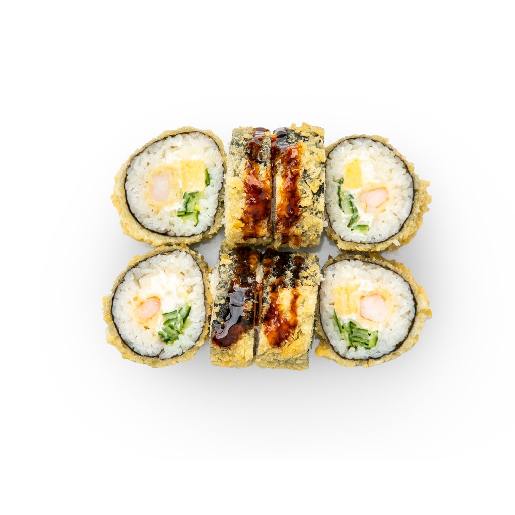 Krémový sýr Philadelphia, okurka, tamago, kreveta v tempuře, unagi omáčka, sweet chilli omáčka, v tempuře a panko
